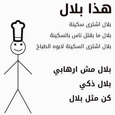 “To jest Bilal. Bilal kupił nóż. Bilal nie zabija ludzi nożem. Bilal kupił nóż, aby gotować. Bilal nie jest terrorystą. Bilal jest mądry. Bądź jak Bilal” – głosi mem po arabsku. Obok narysowano Bilala w kucharskiej czapce na głowie. Post zyskał tysiące polubień. Udostępniło go kilkaset osób. Jeden z Palestyńczyków skomentował mem w ten sposób: “To jest Avichai. Avichai ukradł kraj jego właścicielom. Avichai zabija ludzi przy użyciu broni. Avichai jest okupantem. Nie bądź jak Avichai i wynoś się z naszego kraju”.