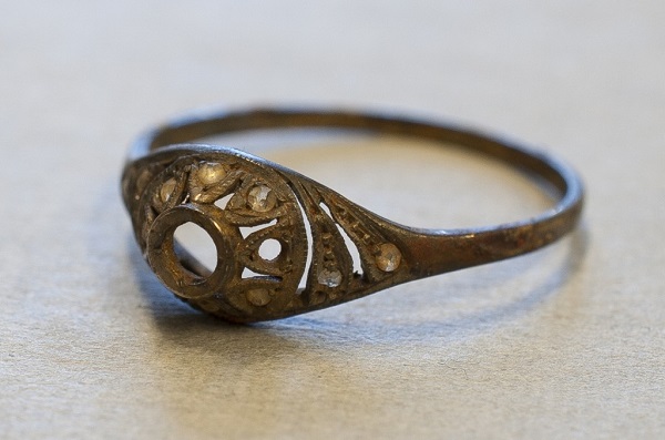 – Pod nim znajdował się m.in. wykonany ze złota damski pierścionek oraz łańcuszek zawinięty w kawałek płótna. Zarówno pierścionek, jak i łańcuszek posiadają cechy probiercze dla złota próby 583 umieszczanej na wyrobach wyprodukowanych w Polsce w latach 1921-1931. To głowa rycerza z cyfrą trzy po prawej stronie. W celu szczegółowego potwierdzenia zawartości znaleziska, obiekt poddany został specjalistycznym badaniom, m.in. wykonano jego zdjęcia RTG, a także wykonano badanie metodą XRF, które wykazało obecność metali, m.in. miedzi, złota i srebra – dodała Kubik.