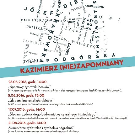 Raz w miesiącu zapraszamy na wspólne zwiedzanie Kazimierza – poszczególne spacery tematycznie nawiązywać będą do rocznicy ważnych, aczkolwiek nieco zapomnianych wydarzeń z dziejów krakowskiej społeczności żydowskiej. Każde spotkanie poprzedzone będzie półgodzinnym wykładem w Żydowskim Muzeum Galicja. Podczas wykładów wybitni specjaliści w danej dziedzinie wprowadzą uczestników w tematykę danego spaceru.
