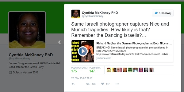 Cynthia McKinney opublikowała film, który ma udowodnić, że Izrael jest odpowiedzialny za ataki w Nicei i Monachium. “Dowodem” jest jej zdaniem obecność w obu miejscach izraelskiego fotografa.