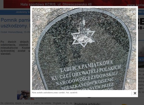 Po dwóch dniach od odsłonięcia nieznani sprawcy zniszczyli tablicę pamiątkową poświęconą Żydom mieszkającym w Kozienicach.