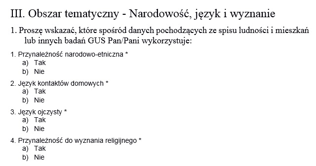 Fragment ankiety z internetowego formularza GUS, będącego elementem konsultacji społecznych