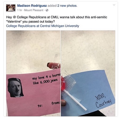 W środę studentka z Mount Pleasant opublikowała na Facebooku zdjęcie kartki, którą otrzymała od Młodych Republikanów z okazji przyjęcia walentynkowego.