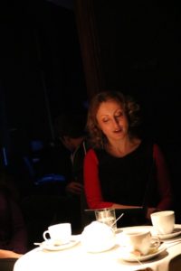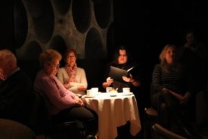 Uczestnicy zasiedli przy kawiarnianych stolikach. Podano kawę i herbatę. Był czas na swobodne pogawędki, jak to bywa w kawiarni. Zabrzmiały także fragmenty tekstu w wykonaniu aktorów teatru BWA. Dźwięki na saksofonie i looperze tworzył Look Sabat.