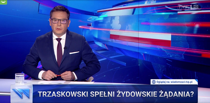 Główny program informacyjny TVP nieustannie krytycznie wypowiada się o opozycyjnym kandydacie na prezydenta, Rafale Trzaskowskim. Tym razem zarzuca mu “odwoływanie się do książek Grossa” oraz sugeruje możliwość “spełnienia żydowskich żądań”.