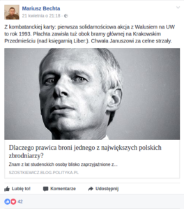 W Warszawskim oddziale IPN pracuje też Mariusz Bechta, również zainteresowany historią NSZ. Razem z Wojciechem Muszyńskim napisał książkę “Przeciwko Pax Sovietica”. O Januszu Walusiu pisał na FB: “Chwała Januszowi za celne strzały”.