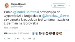 “Czy oznaką kręgosłupa jest zmiana nazwiska z Berman na Borowski?” napisała dziś na Twitterze Magdalena Ogórek, była kandydatka na prezydenta, obecnie współpracująca z TVP. To…